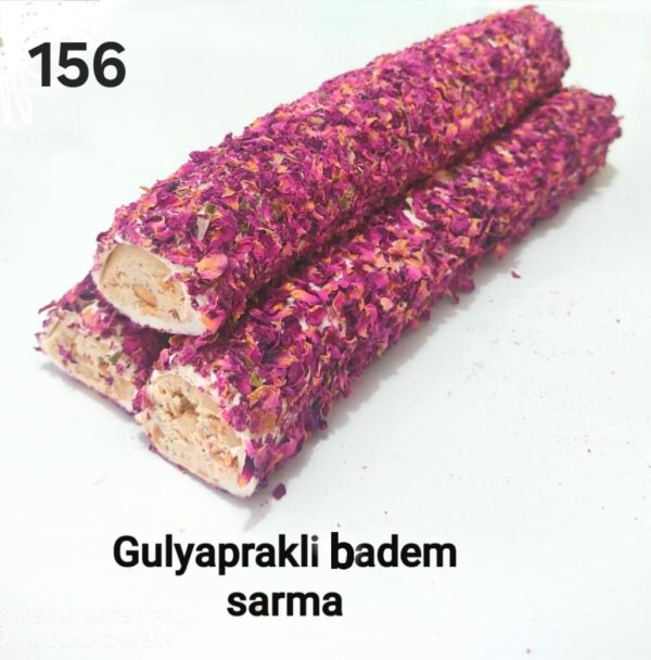 Gerçek gül yapraklarının muhteşem rengi ve mis kokusuyla sarılmış eşsiz bir lezzet. İçi bol badem parçacıklı zengin bir dolguyla tamamlanan ‘Gülyapraklı Badem Sarma’, hem göze hem damağa hitap eden, lüks ve aromatik bir deneyim.