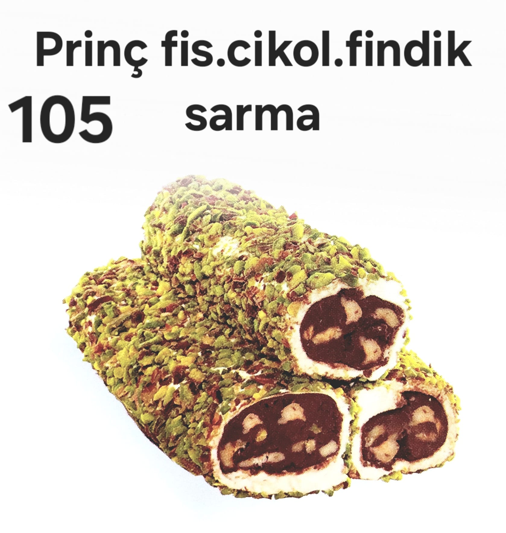 Fıstık, çikolata ve fındık bir arada! Dışı bol pirinç fıstıkla kaplı, içi ise yoğun çikolata dolgusu ve bütün fındık taneleriyle dolu. ‘Pirinç Fıstık Çikolata Fındık Sarma’, her lokmada zenginlik sunan, bol malzemeli bir şölen.