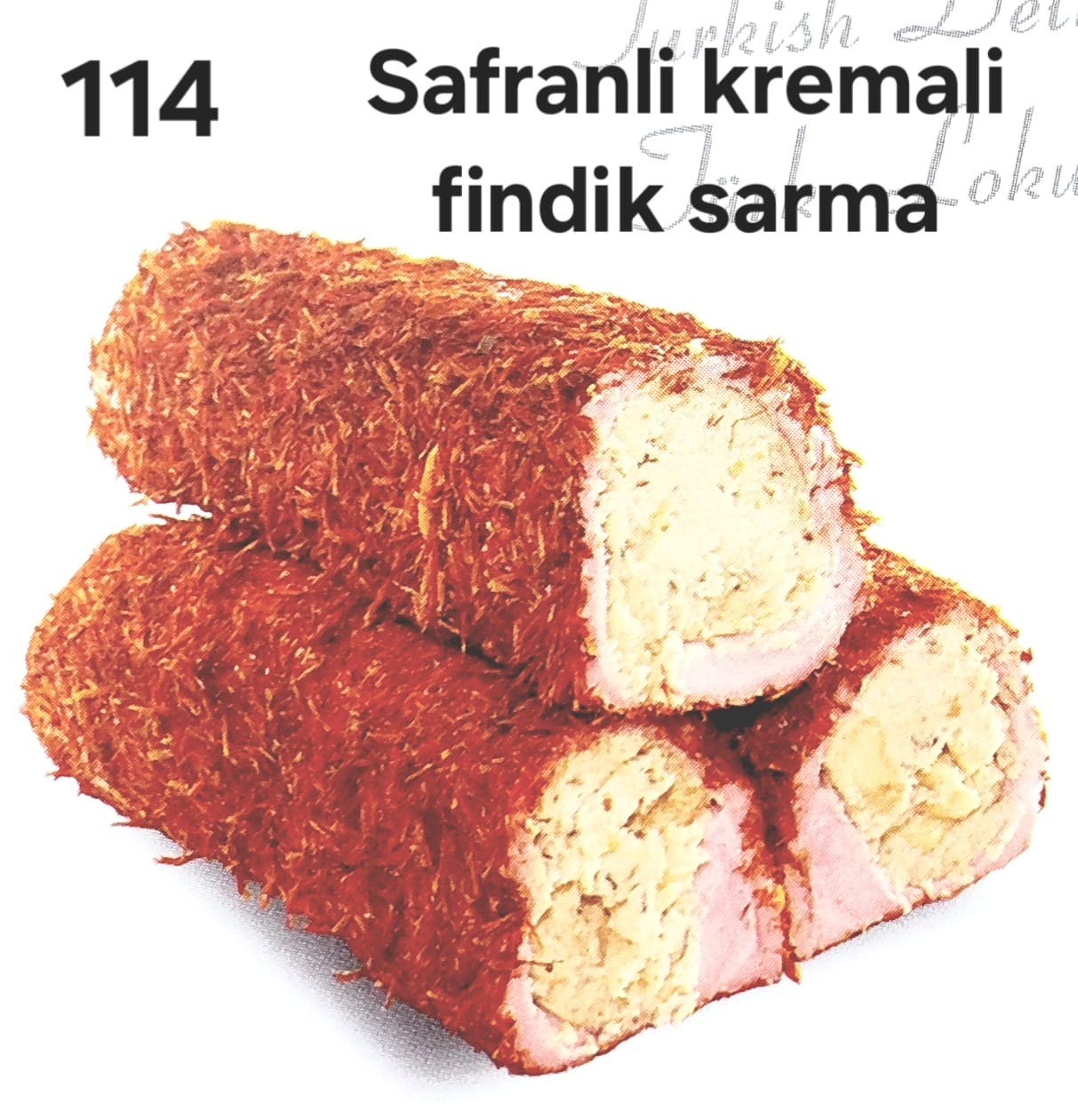 Değerli safran çubuklarıyla kaplanmış, içi bol fındık parçacıklı zengin krema dolgulu… ‘Safranlı Kremalı Fındık Sarma’, aromatik ve lüks bir lezzet şöleni sunuyor. Bu özel ve yoğun tadı keşfedin.