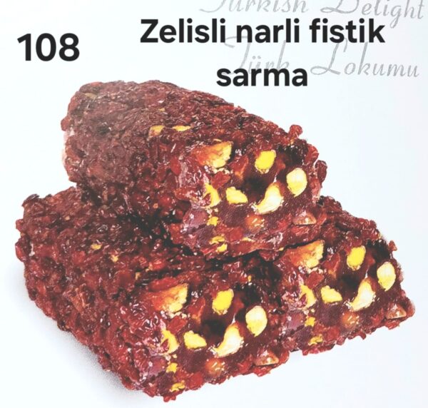 Gerçek Antep fıstığı şöleni! Narın mayhoş lezzeti, bol ve bütün fıstık taneleriyle birleşti. Dışını kaplayan özel zeliş (nar tanecikleri) ile ‘Zelisli Narlı Fıstık Sarma’, her lokmada yoğun fıstık ve zengin meyve tadı sunuyor.